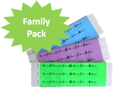 Blue 20 family pack of disposable identification wristbands including a water resistant marker and resealable pack.
